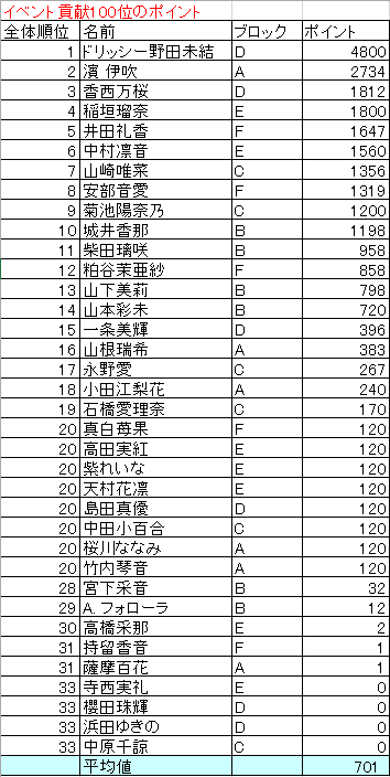 私は、やっぱり貢献100位のポイントに目が行きます。ここが高い=多くの人に応援されていると思うからです。その多くの人に応援されているという実績は、例えファイナルイベントで1位ではなくても、グランプリや各賞を受賞するのには十分な理由となります。