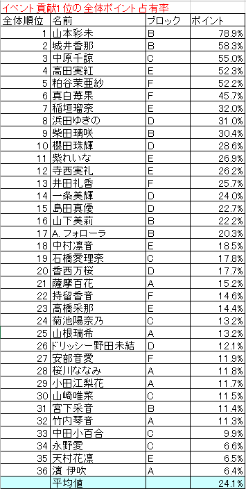 各ルームの貢献1位の人が、そのルームがイベント中に獲得したポイントの何%を占めているかです。先ほどの貢献ポイントが高くても、この率が低ければ、1位の人への依存度ば下がります。